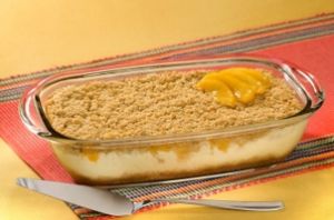 - Unte uma forma média retangular com manteiga ou margarina polvilhada com farinha de trigo, acomode metade da massa farofinha, despeje o recheio e por cima espalhe o pêssego picado, cubra com o restante da massa farofinha e leve ao forno médio (180ºC) pré-aquecido e deixe assar por 50 minutos. Retire do forno, deixe esfriar e sirva a seguir.